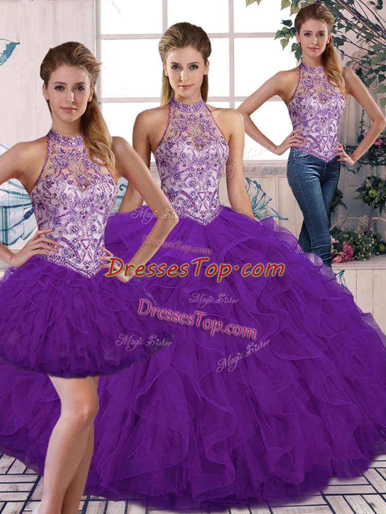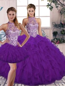 Elegant Halter Top Sleeveless 15th Birthday Dress Floor Length Beading and Ruffles Purple Tulle