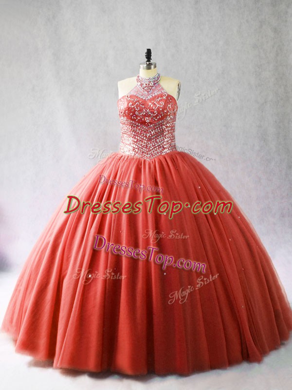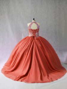 Elegant Halter Top Sleeveless Brush Train Lace Up Quinceanera Dresses Red Tulle