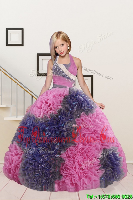Elegant Halter Top Sleeveless Floor Length Beading and Ruffles Lace Up Pageant Dress with Pink and Dark Purple