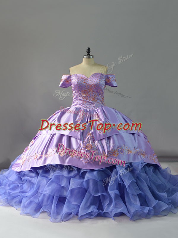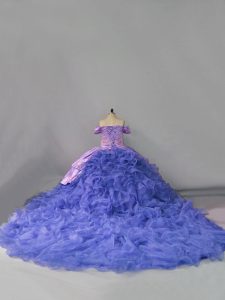 Elegant Lavender Organza Lace Up Quince Ball Gowns Sleeveless Chapel Train Embroidery and Ruffles