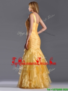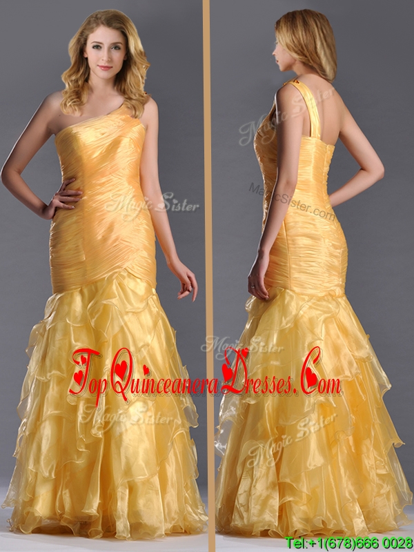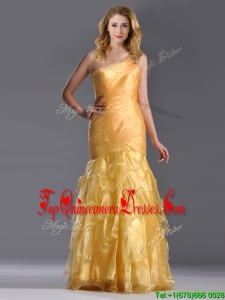 Elegant Mermaid One Shoulder Organza Ruffled Dama Dress in Gold