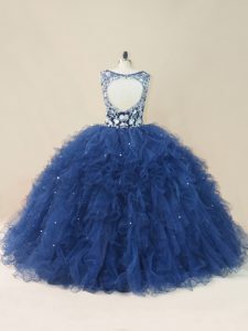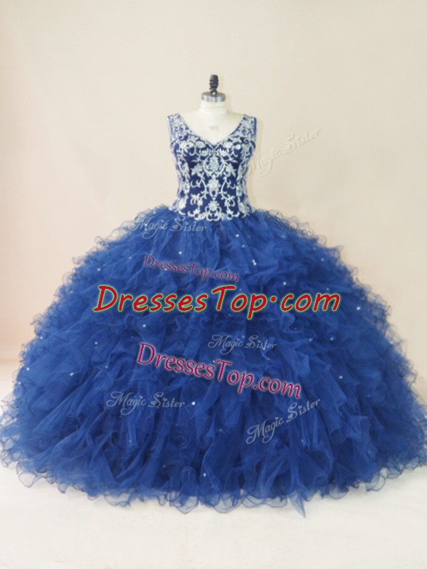 Elegant Navy Blue V-neck Neckline Embroidery and Ruffles Sweet 16 Dresses Sleeveless Backless
