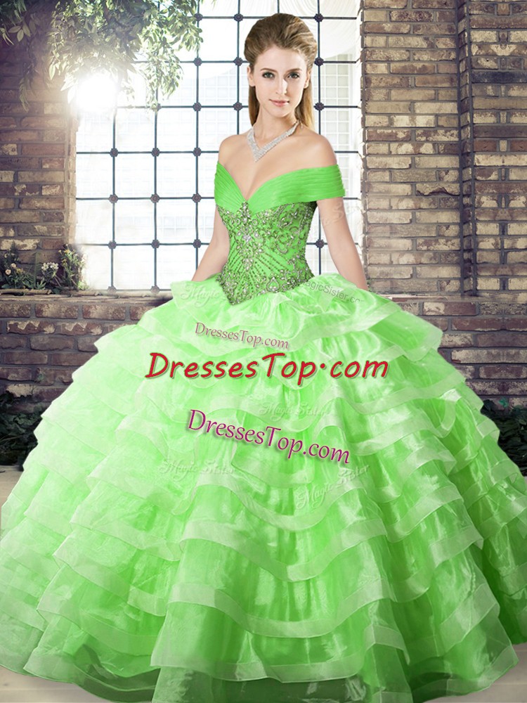 Elegant Off The Shoulder Lace Up Beading and Ruffled Layers Vestidos de Quinceanera Brush Train Sleeveless