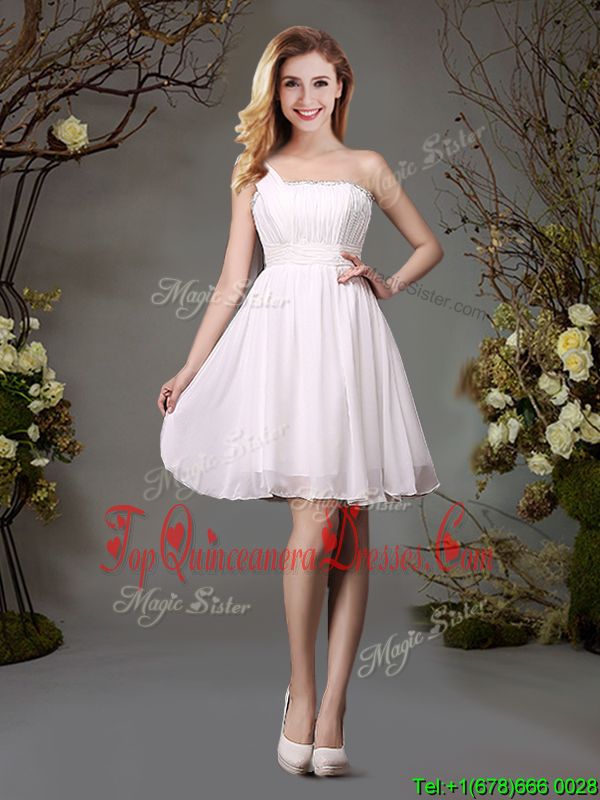 Elegant One Shoulder Mini Length Zipper Court Dresses for Sweet 16 White and In for Prom and Party and Wedding Party with Beading and Ruching