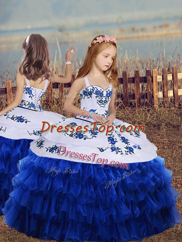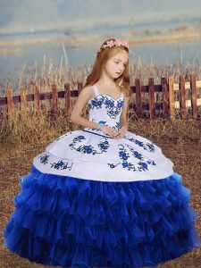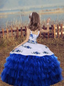 Elegant Organza Straps Sleeveless Lace Up Embroidery and Ruffled Layers Little Girls Pageant Dress in Royal Blue