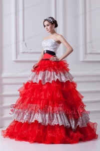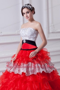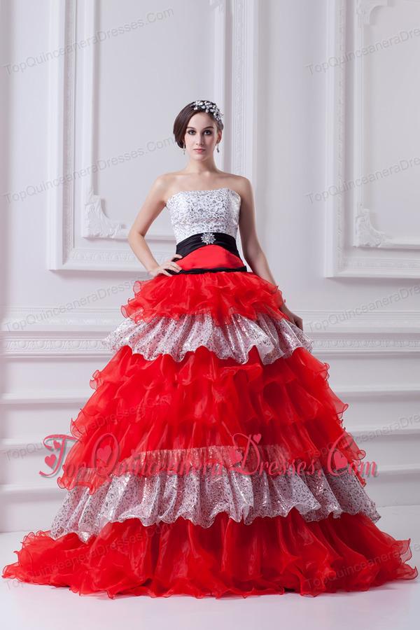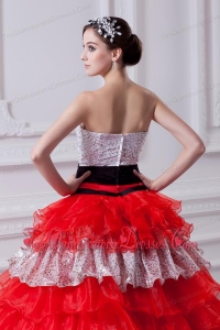 Elegant Princess Strapless Beading Ruflled Layers Red Quinceanera Dress in 2014
