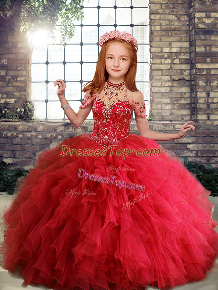 Elegant Ruffles Pageant Gowns For Girls Red Lace Up Sleeveless Floor Length