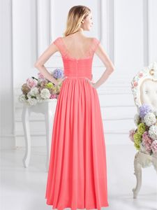 Elegant Scoop Cap Sleeves Floor Length Lace and Ruching Zipper Court Dresses for Sweet 16 with Watermelon Red
