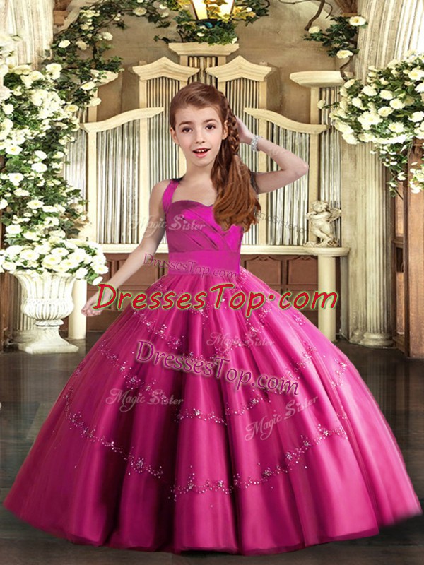 Elegant Sleeveless Floor Length Beading Lace Up Child Pageant Dress with Fuchsia