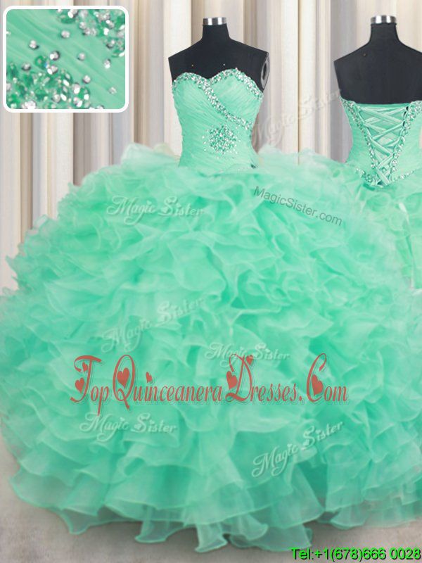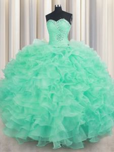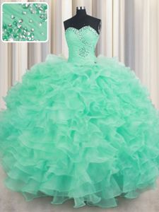 Elegant Sleeveless Organza Floor Length Lace Up 15 Quinceanera Dress in Turquoise for with Beading and Ruffles
