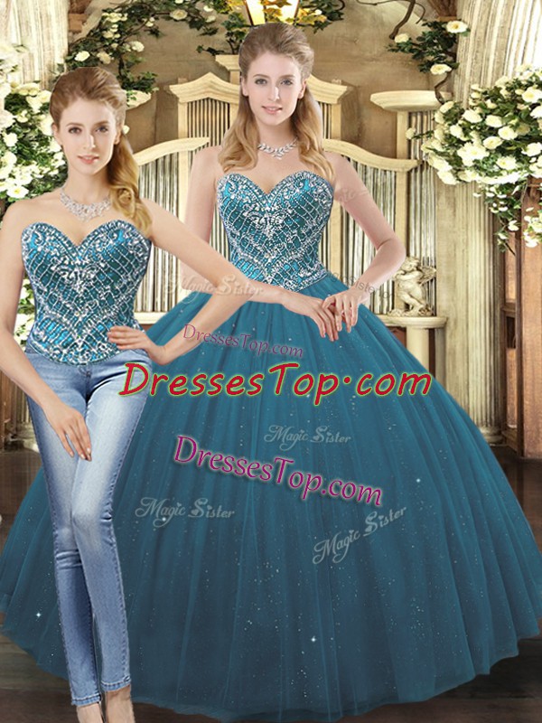 Elegant Teal Ball Gowns Sweetheart Sleeveless Tulle Floor Length Lace Up Beading and Ruffles Quinceanera Gowns