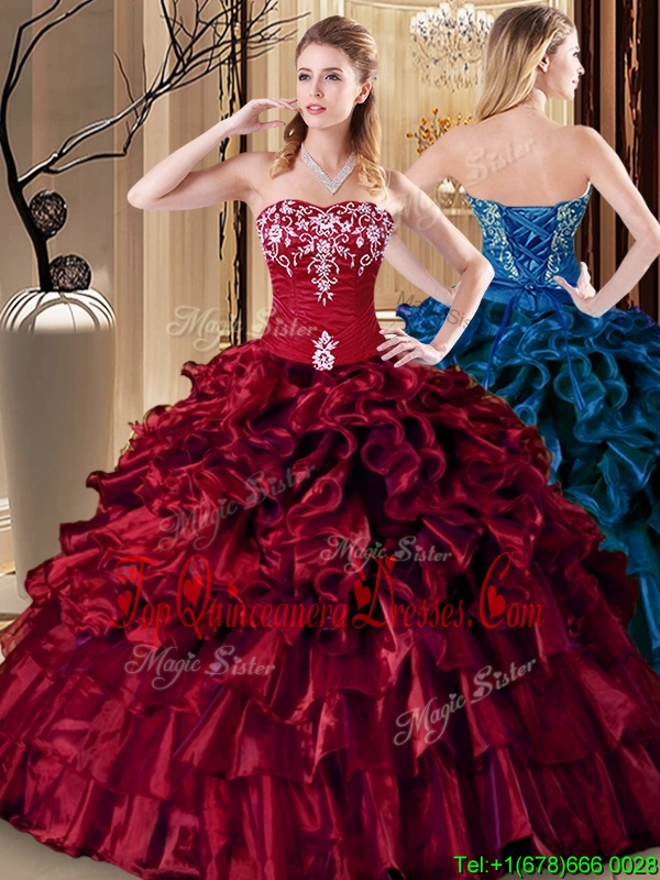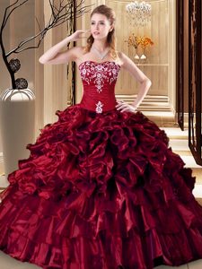 Elegant Wine Red Sleeveless Floor Length Embroidery and Ruffles Lace Up Sweet 16 Dresses