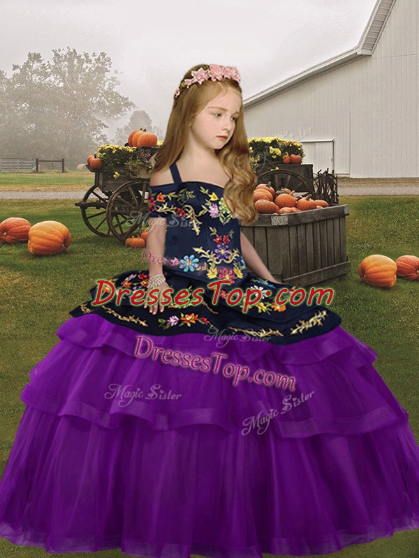 Embroidery and Ruffled Layers Child Pageant Dress Purple Lace Up Sleeveless Floor Length