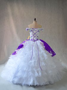 Embroidery and Ruffles Ball Gown Prom Dress White And Purple Lace Up Sleeveless Floor Length