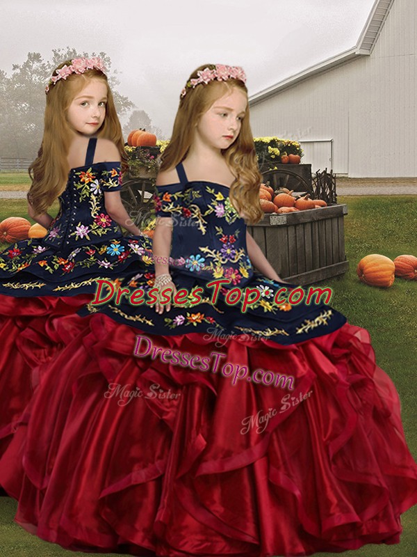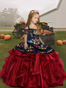 Embroidery and Ruffles Little Girls Pageant Dress Wine Red Lace Up Sleeveless Floor Length