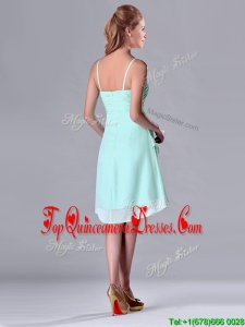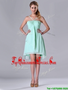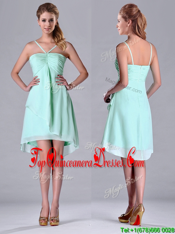 Empire Straps Apple Green Ruching Short Dama Dress in Chiffon