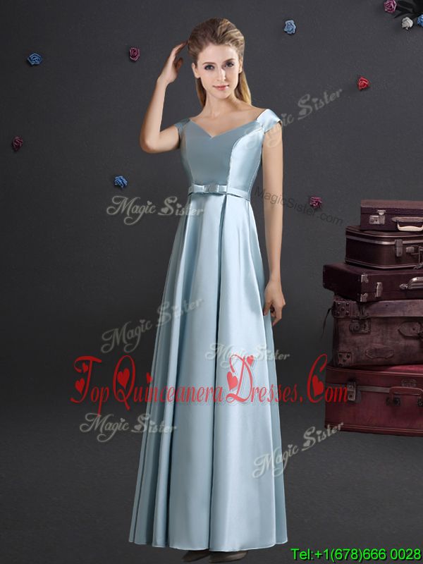 Empire Vestidos de Damas Light Blue Off The Shoulder Elastic Woven Satin Cap Sleeves Floor Length Zipper