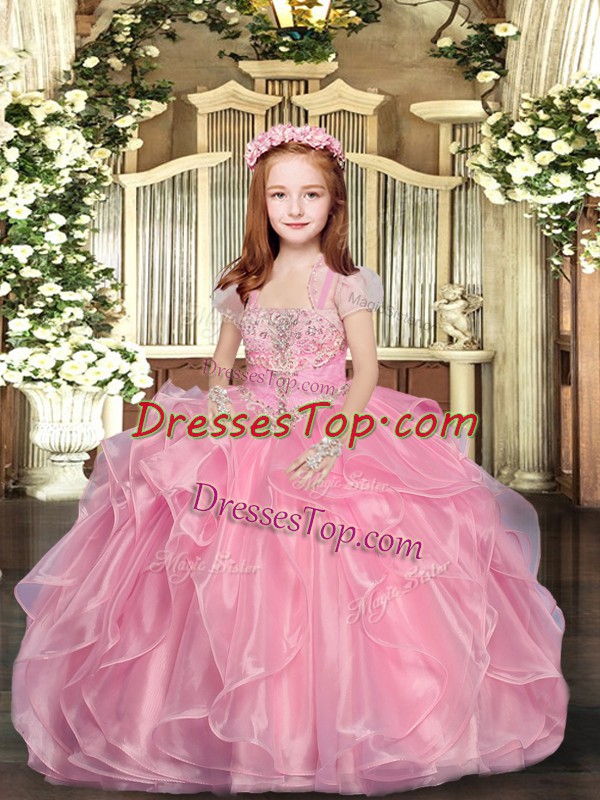 Enchanting Baby Pink Ball Gowns Organza Straps Sleeveless Beading Floor Length Lace Up Little Girls Pageant Dress Wholesale