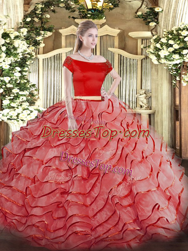 Enchanting Coral Red Two Pieces Off The Shoulder Short Sleeves Tulle Brush Train Zipper Ruffled Layers Quince Ball Gowns