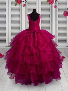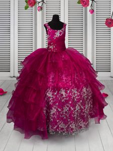Enchanting Fuchsia Straps Lace Up Appliques and Ruffled Layers Winning Pageant Gowns Sleeveless