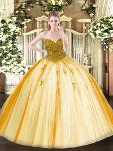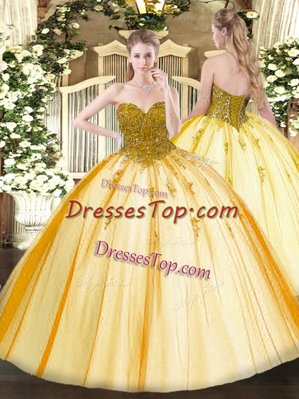 Enchanting Gold Ball Gowns Beading Quinceanera Gowns Lace Up Tulle Sleeveless Floor Length
