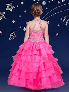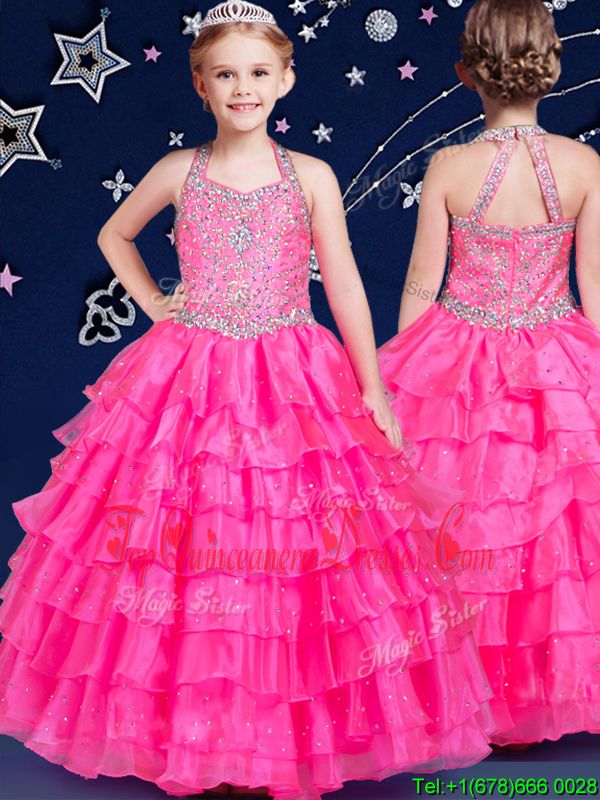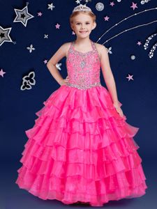Enchanting Halter Top Hot Pink Sleeveless Beading and Ruffled Layers Floor Length Pageant Dress Wholesale