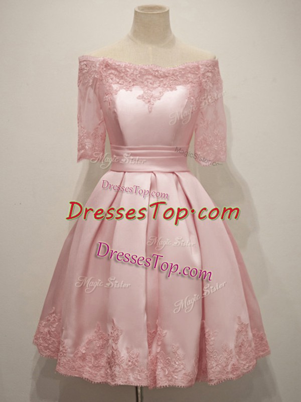 Enchanting Lace Quinceanera Dama Dress Pink Lace Up Half Sleeves Knee Length