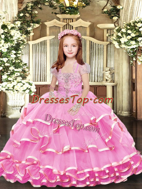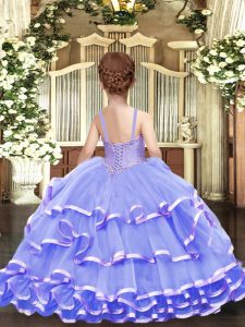 Enchanting Lilac Ball Gowns Organza Straps Sleeveless Beading and Ruffled Layers Floor Length Lace Up Little Girls Pageant Dress