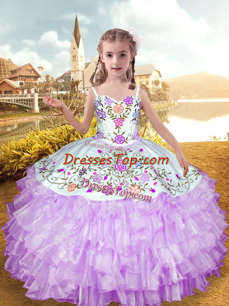 Enchanting Organza and Taffeta Straps Sleeveless Lace Up Embroidery and Ruffled Layers Pageant Dress for Teens in Lilac