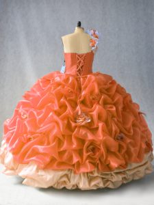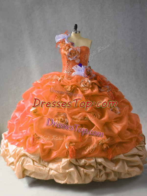 Enchanting Rust Red One Shoulder Neckline Beading and Pick Ups and Hand Made Flower Quince Ball Gowns Sleeveless Lace Up