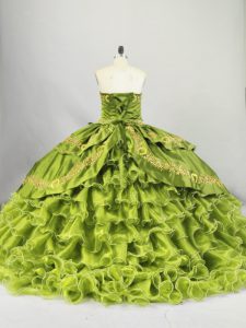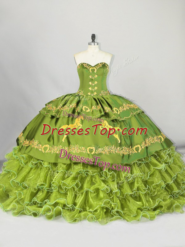 Enchanting Sleeveless Embroidery and Ruffled Layers Lace Up Sweet 16 Quinceanera Dress with Olive Green Brush Train