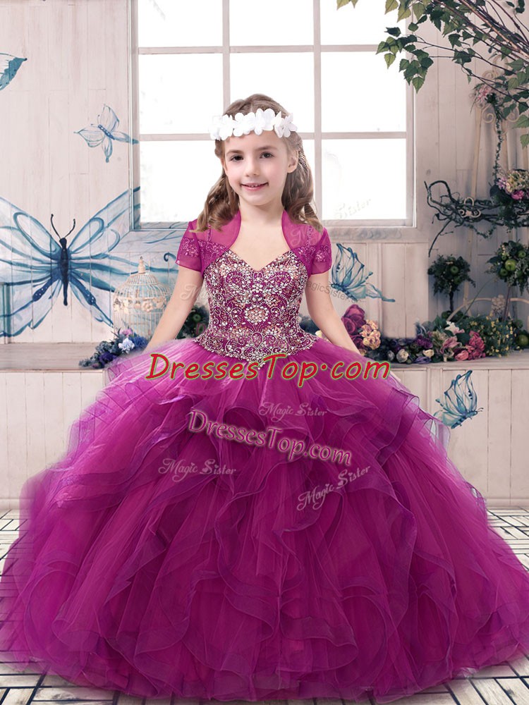 Enchanting Sleeveless Tulle Floor Length Lace Up Kids Formal Wear in Fuchsia with Beading and Ruffles