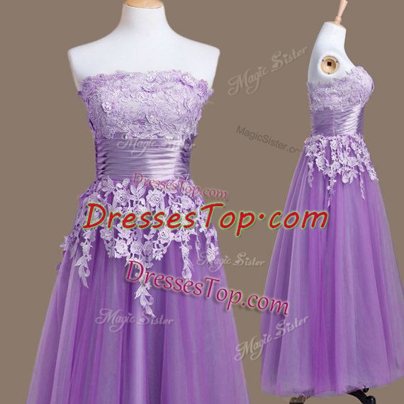 Enchanting Strapless Sleeveless Tulle Dama Dress for Quinceanera Appliques Lace Up