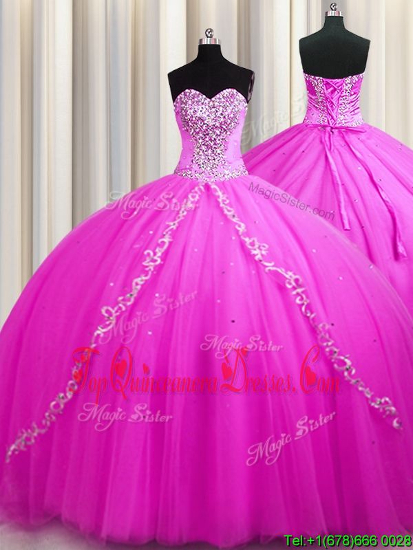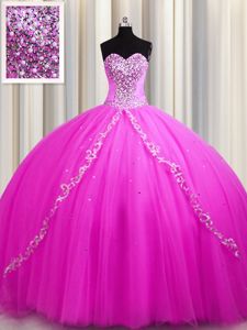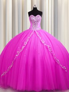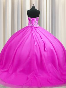Enchanting Sweep Train Sleeveless Tulle Floor Length Lace Up Quinceanera Gowns in Rose Pink for with Beading