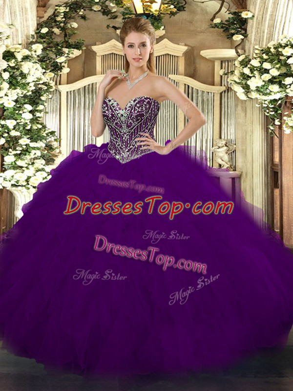 Enchanting Sweetheart Sleeveless Quinceanera Gown Floor Length Beading and Ruffles Dark Purple Tulle