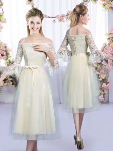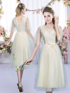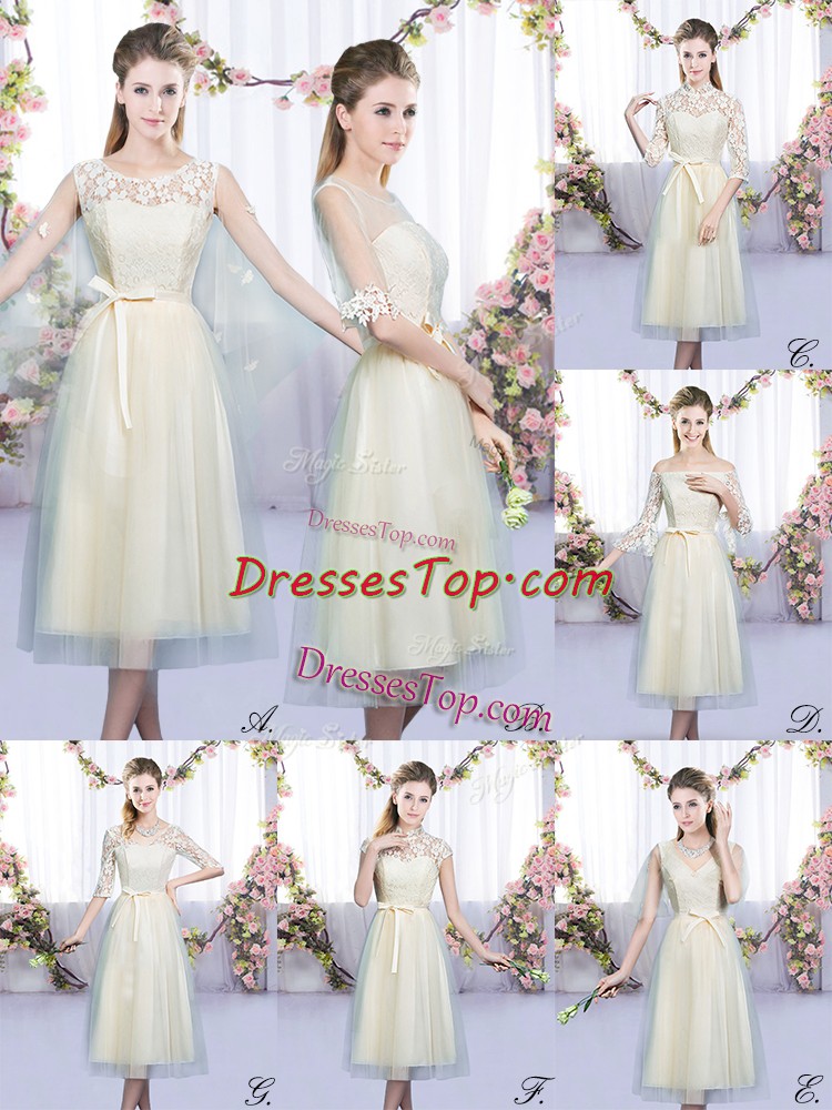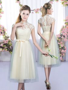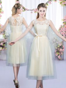 Enchanting Tea Length Champagne Damas Dress Scoop Sleeveless Lace Up