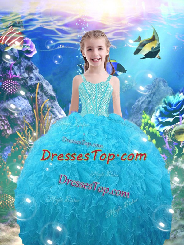 Excellent Beading and Ruffles Little Girls Pageant Dress Aqua Blue Lace Up Sleeveless Floor Length