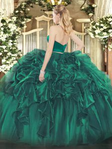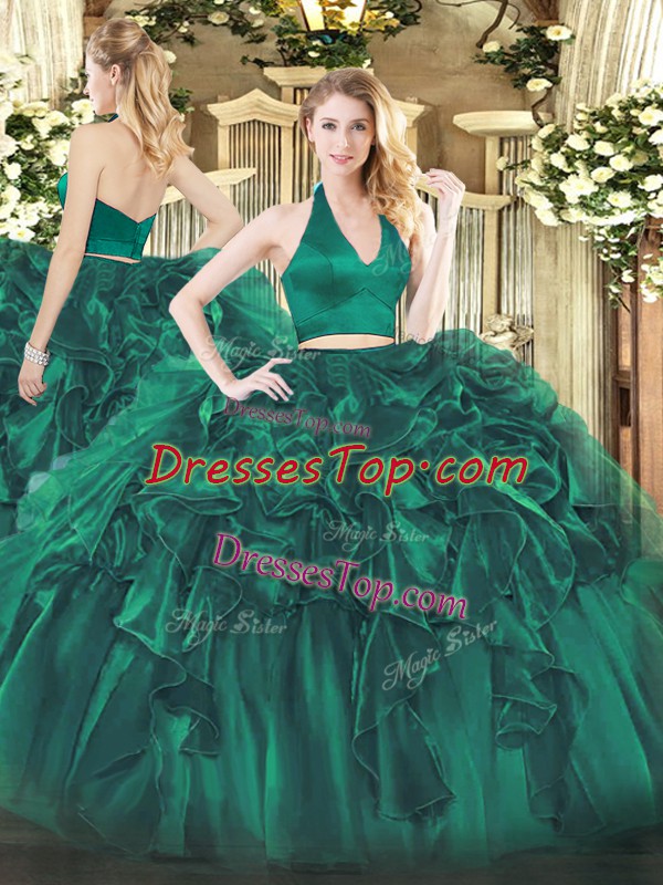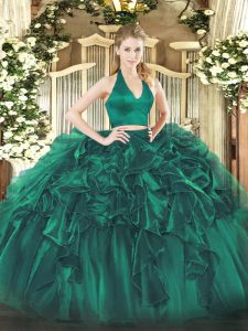 Excellent Dark Green Halter Top Neckline Ruffles Quinceanera Dress Sleeveless Zipper