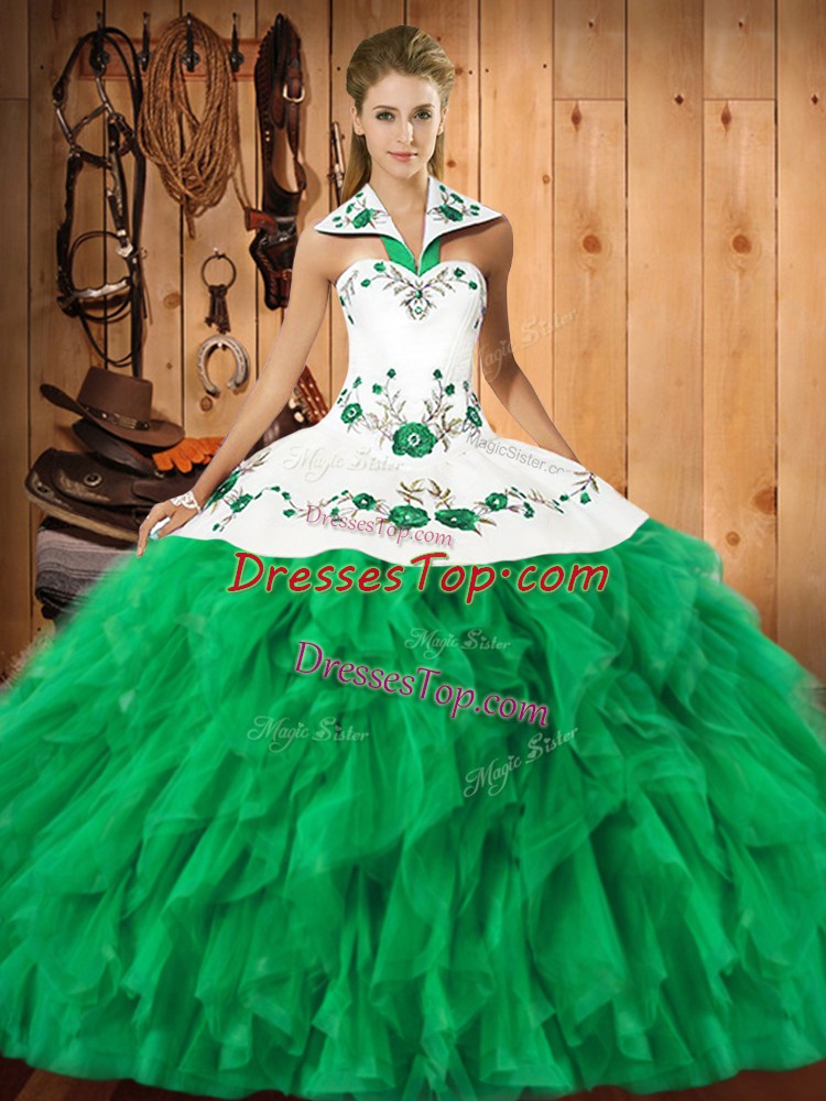 Excellent Green Ball Gowns Satin and Organza Halter Top Sleeveless Embroidery and Ruffles Floor Length Lace Up 15 Quinceanera Dress