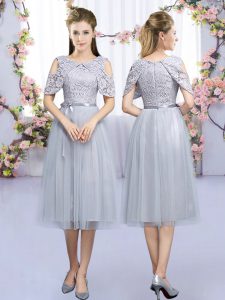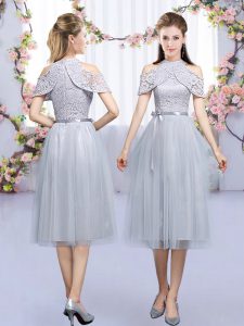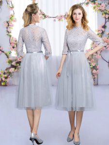 Excellent Grey High-neck Neckline Lace and Belt Quinceanera Court Dresses Half Sleeves Zipper