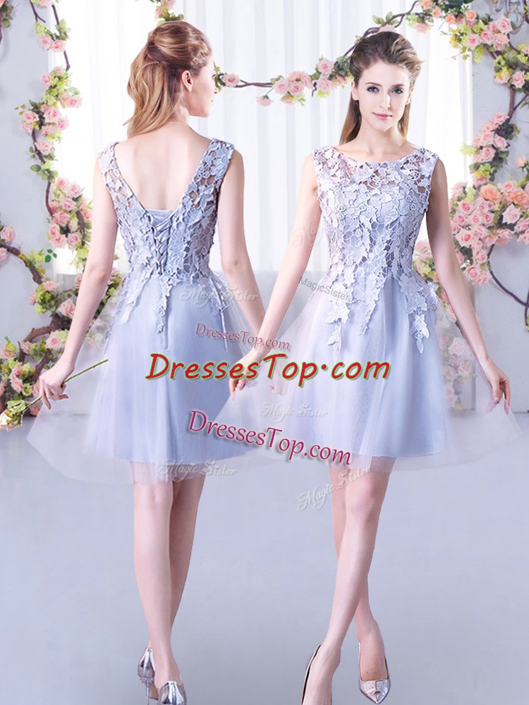 Excellent Grey Tulle Lace Up Scoop Sleeveless Mini Length Quinceanera Dama Dress Lace