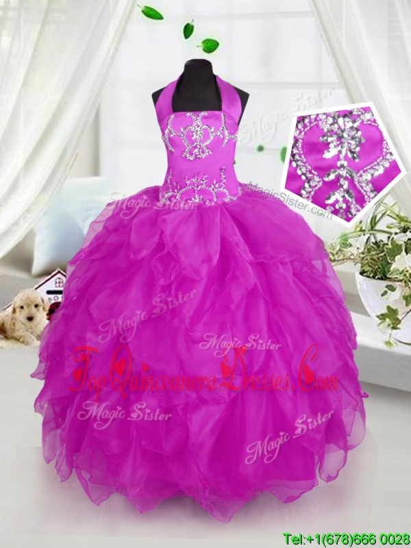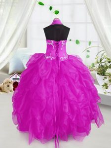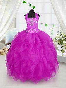 Excellent Halter Top Sleeveless Winning Pageant Gowns Floor Length Appliques and Ruffles Purple Organza