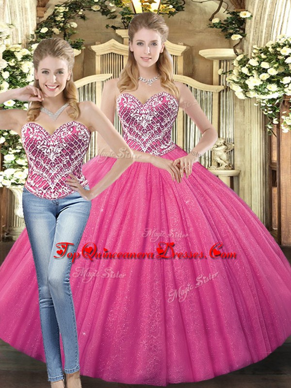 Excellent Hot Pink Lace Up Vestidos de Quinceanera Beading Sleeveless Floor Length