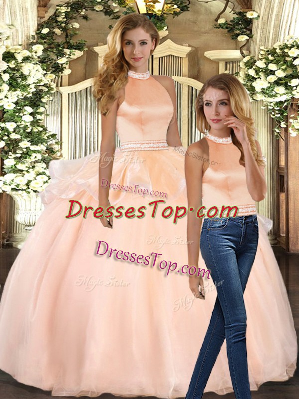 Excellent Organza Halter Top Sleeveless Backless Beading 15th Birthday Dress in Peach