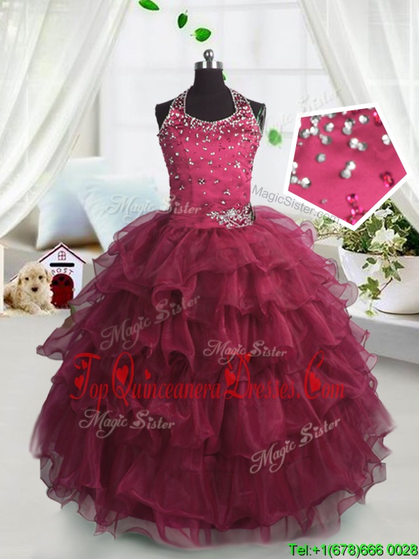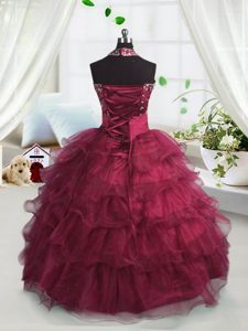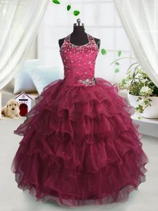 Excellent Organza Scoop Sleeveless Lace Up Beading and Ruffled Layers Little Girls Pageant Dress in Watermelon Red