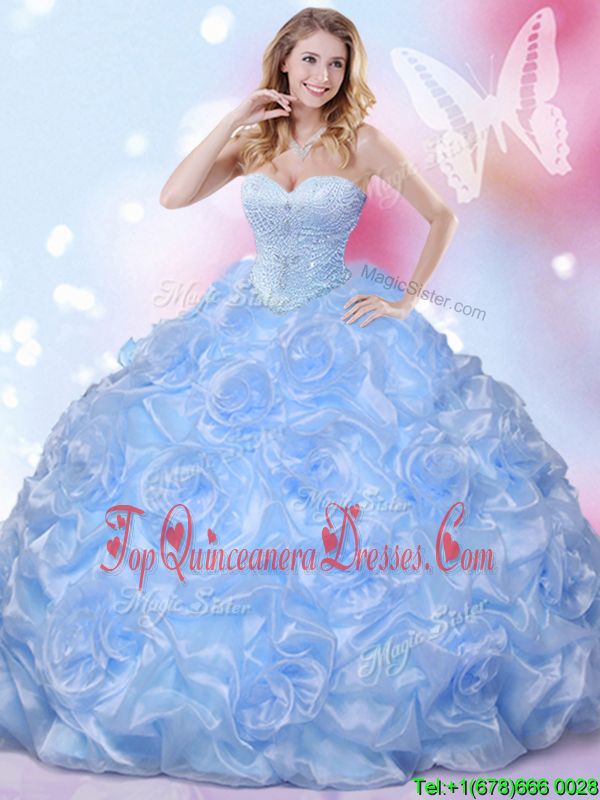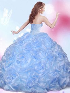 Excellent Sleeveless Fabric With Rolling Flowers Floor Length Lace Up Sweet 16 Dress in Blue for with Beading and Pick Ups