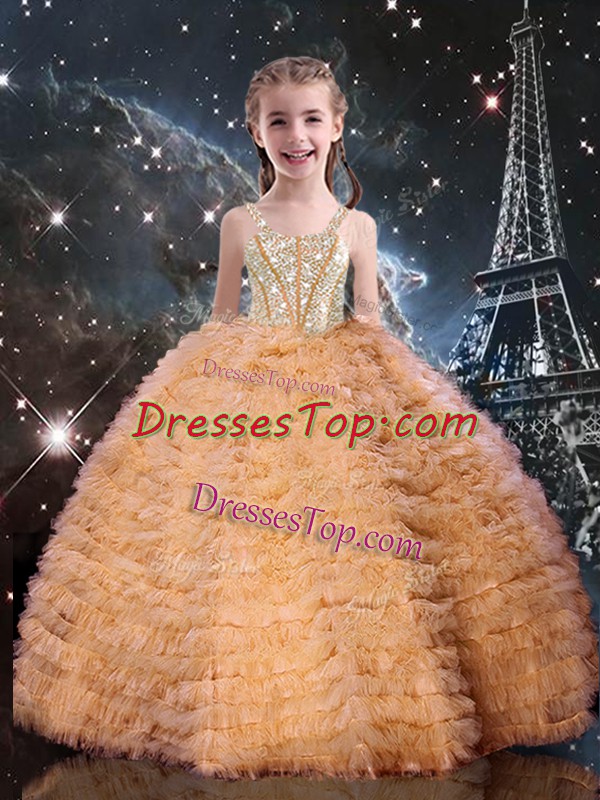 Excellent Sleeveless Floor Length Beading and Ruffled Layers Lace Up Pageant Gowns For Girls with Orange Red