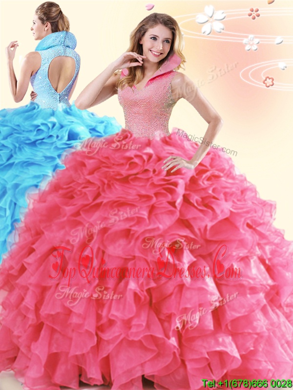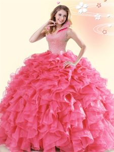 Excellent Sleeveless Organza Floor Length Backless Vestidos de Quinceanera in Coral Red for with Beading and Ruffles