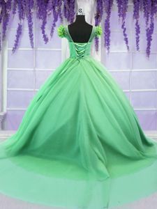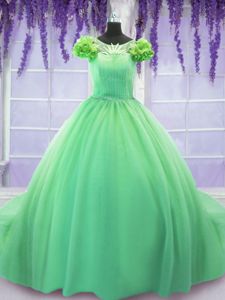 Excellent Tulle Scoop Short Sleeves Court Train Lace Up Hand Made Flower Quinceanera Dresses in Green