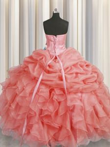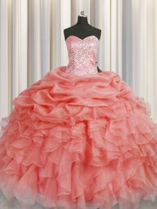 Exceptional Floor Length Lace Up Quinceanera Dress Watermelon Red and In for Military Ball and Sweet 16 and Quinceanera with Beading and Ruffles